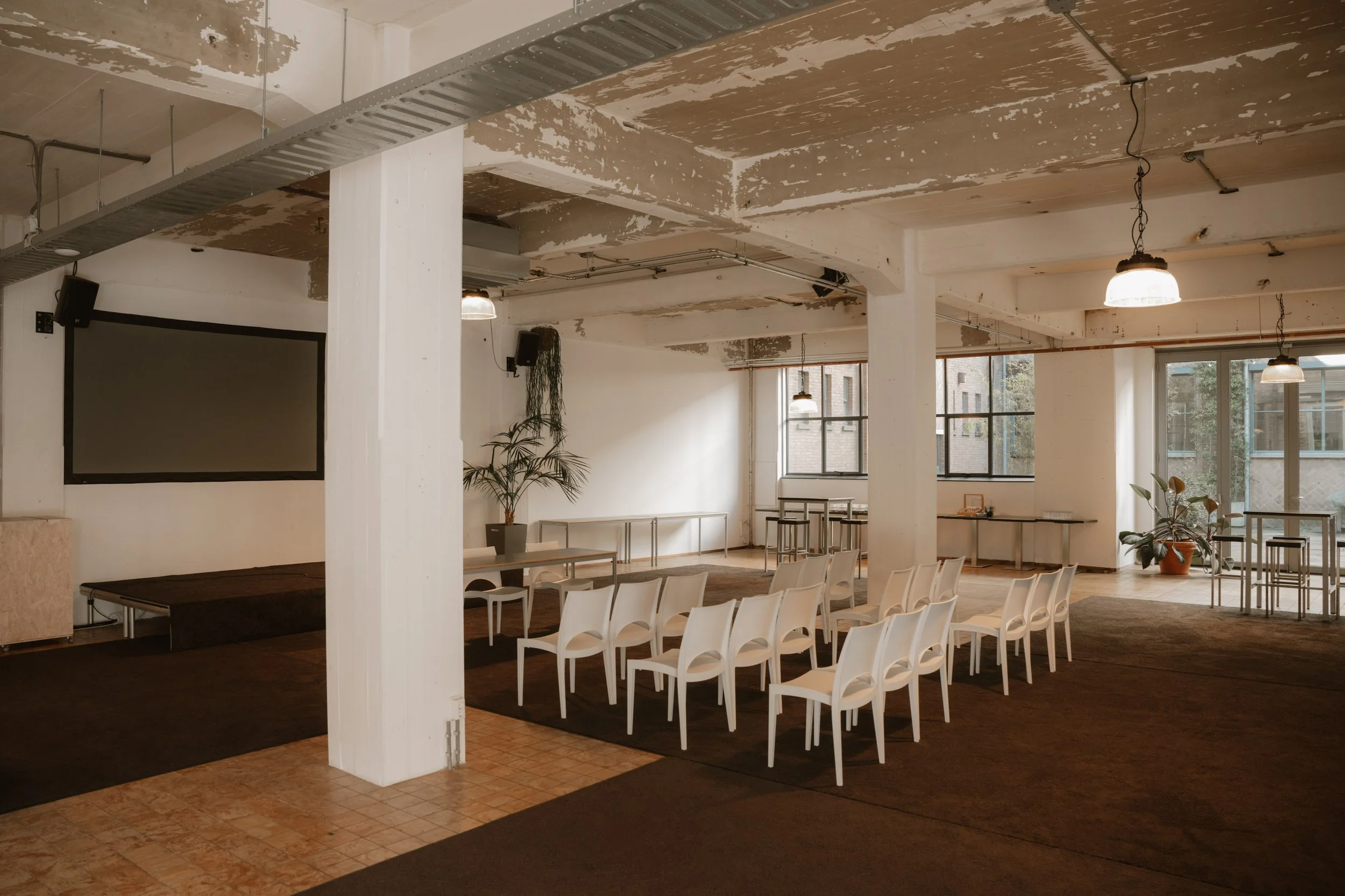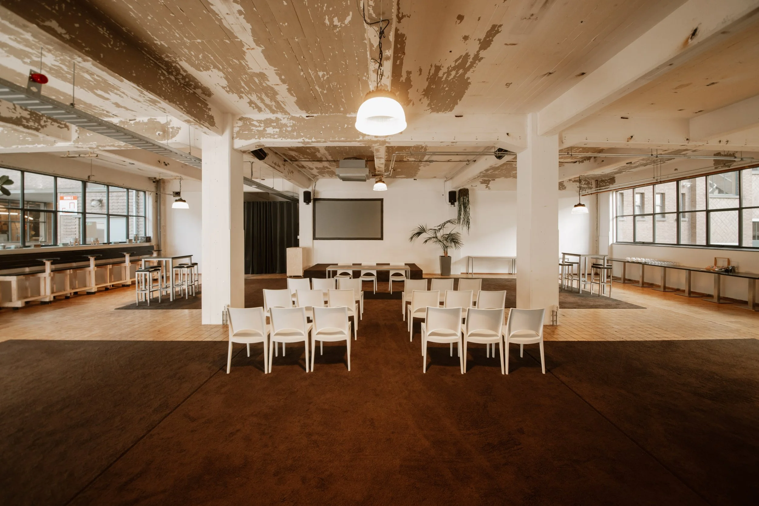 De ruimte biedt rust en overzicht, maar voelt tegelijkertijd levendig door de omgeving waarin hij zich bevindt. Een fijne plek voor events die inhoud en energie mogen combineren.
